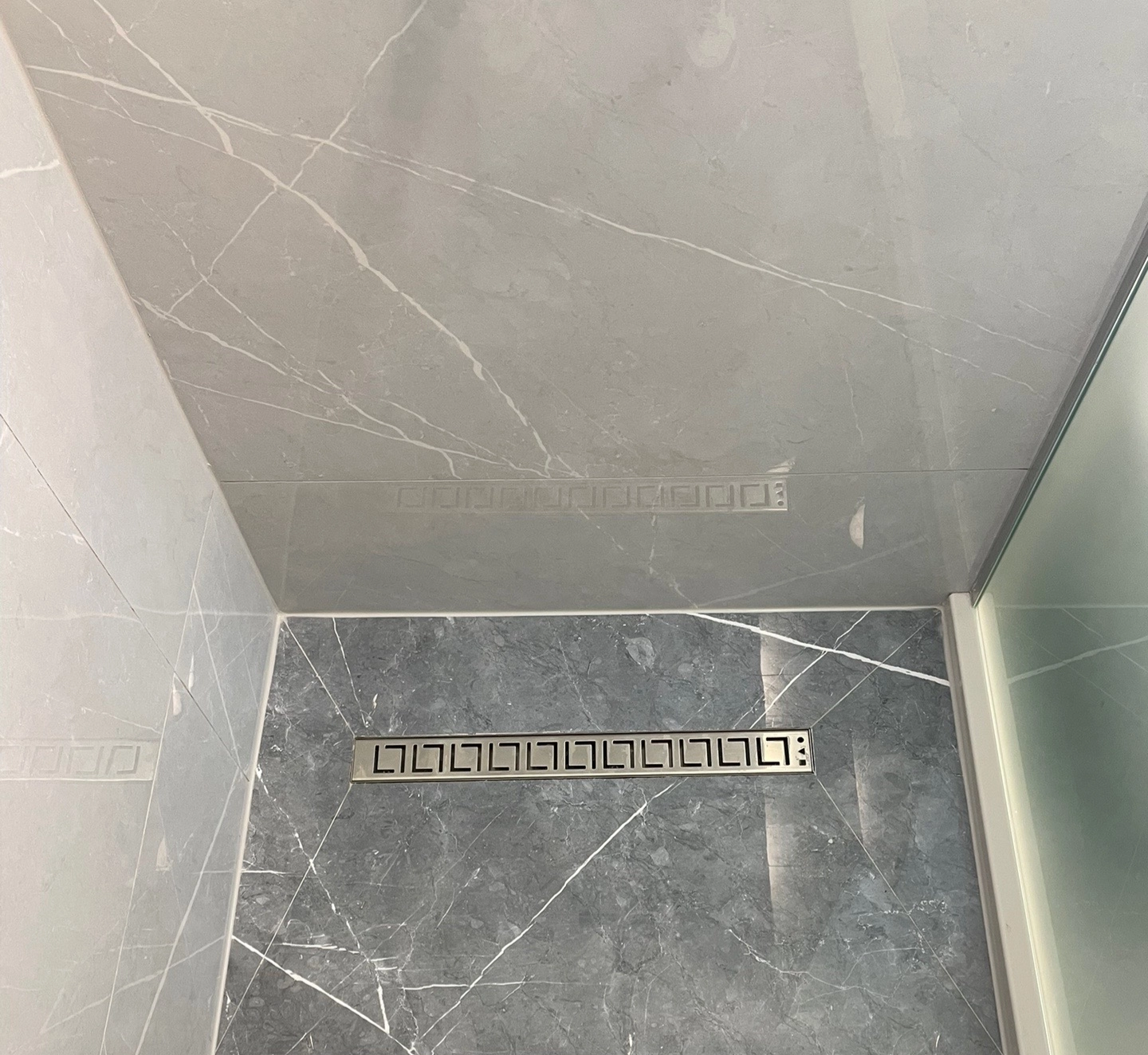 Pose précise, pente d’écoulement correcte et revêtements antidérapants pour une douche moderne et sûre.